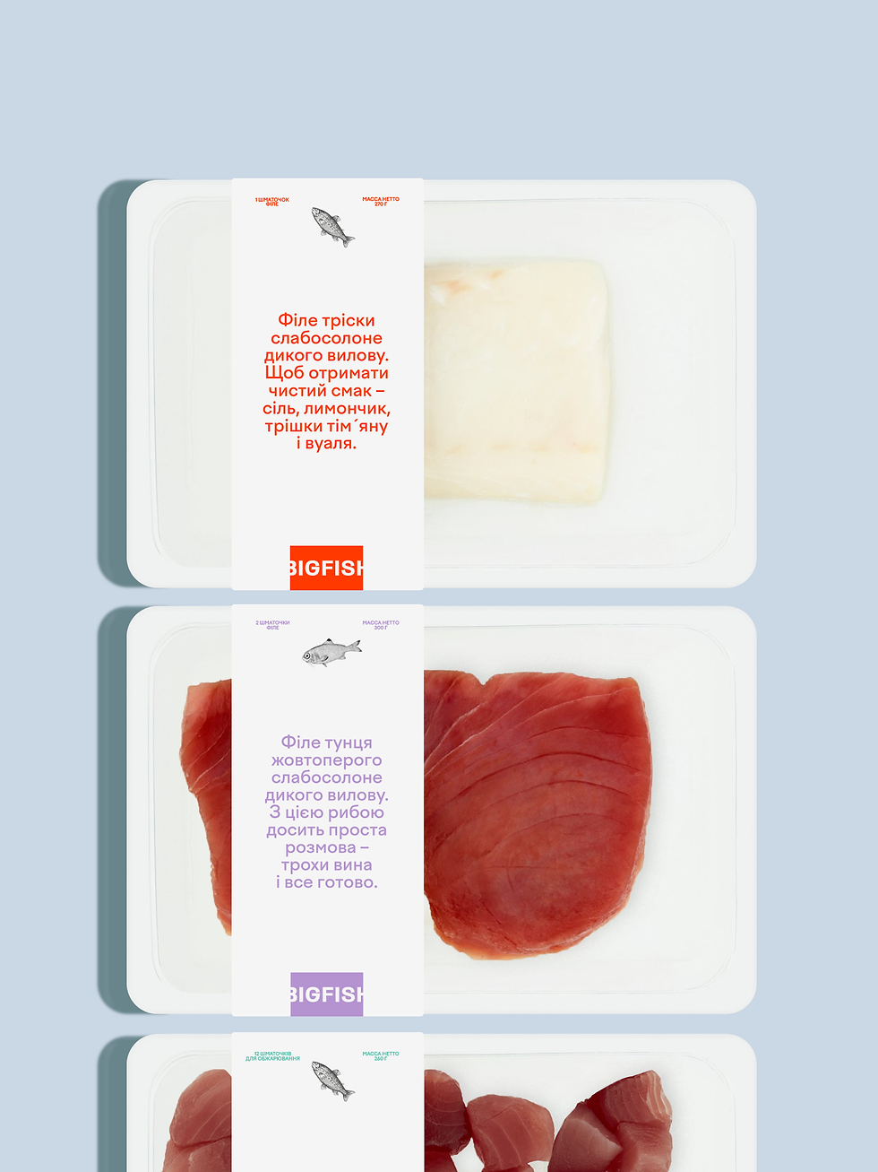 The majority of people in Ukraine don’t understand how to choose fish and cook it. They prefer meat. So the brand style should be easy and put fear away. We wanted to be forthright. Bigfish's identity should be big. So big that it's out of frame. So big that the main brand heroes are huge fishes.